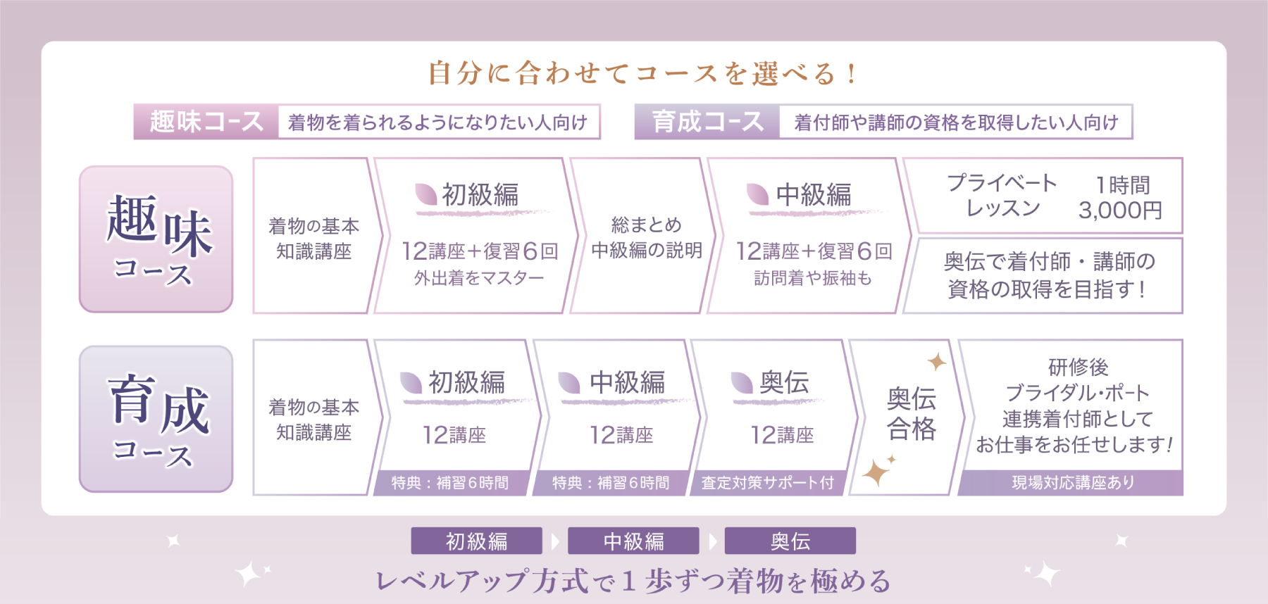 - 趣味コースと育成コース他、単発レッスンの 3時間体験レッスン、プライベートレッスン、着付け師さん向けレッスンをご用意しております。